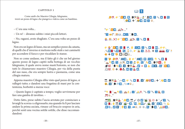 Het wereldberoemde werk van Carlo Collodi, Pinokkio, is onlangs gepubliceerd in Italiaanse emojitaal, ofwel emojitaliano.