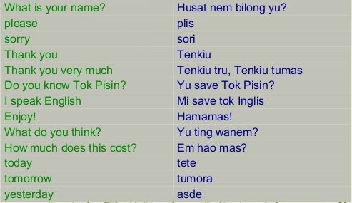 In het licht van deze ongelooflijke taalkundige diversiteit hebben de Papoea’s voor Tok Pisin gekozen, een creoolse taal die op het Engels gebaseerd is maar met Duits, Portugees en autochtone Papoease talen erin. Het begon als een mengtaal, ontwikkeld door handelaars in de 19e eeuw. In de afgelopen decennia werd ze de belangrijkste taal in Papoea-Nieuw-Guinea. Er is een krant in Tok Pisin en de taal is populair in de kerk. Tok Pisin wordt nu gesproken door 4 miljoen Papoea’s, een meerderheid van de bevolking. Het feit dat ze als een mengtaal begon, verklaart haar succes: door de eenvoudige woordenschat is ze gemakkelijk aan te leren. Door haar gemengde erfgoed is ze verbluffend expressief. Pikinini betekent ‘kind’ en komt uit het Portugees. Het Tok Pisin voor ‘stadsbewoner’ is susok man – ‘shoe sock man’ in het Engels.